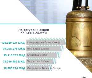Со акциите на Комерцијална банка е остварен промет од 108,3 милиони денари, со акциите на НЛБ Банка, 97,3 милиони денари, со акциите на Алкалоид, 95,1 милиони денари, со акциите на Макпетрол, 35 милиони денари и со акциите на Македонски телеком, 18,8 милиони денари.