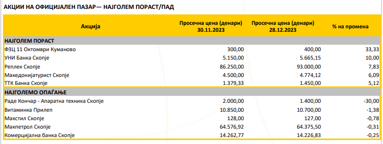 Македонската берза го објави билтенот за декември минатата година, а оваа се акциите со најголем раст и пад во тој период: