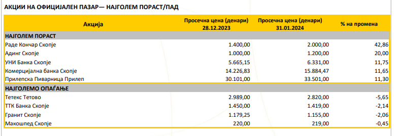 Македонската берза го објави билтенот за јануари, а оваа се акциите со најголем раст и пад за тој период: