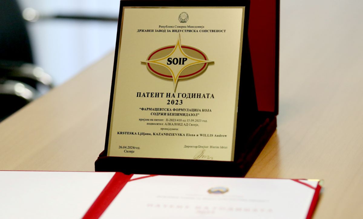 Иновативната формулација на „Алкалоид“ АД за лекот со додадена вредност „Омепразол“ во течна форма, готов за употреба, прва од ваков тип во светски рамки, е прогласена за „Патент на годината за 2023“ од Државниот завод за индустриска сопственост, во рамките на пригодното одбележување на Светскиот ден на интелектуалната сопственост – 26. април, информираа од компанијата.