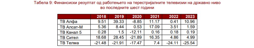 Анализата на пазарот на Агенцијата за аудио и аудиовизуелни медиумски услуги за 2023 година покажува дека терестријалните телевизии на државно ниво Алфа, Алсат-М, Канал 5 и Сител лани оствариле добивка, додека Телма работела со загуба.