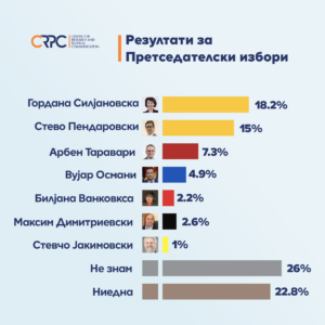 За кандидатката на опозициската ВМРО-ДПМНЕ, Гордана Силјановска Давкова на престојните претседателски избори би гласале 18,2% од граѓаните, за кандидатот на владејачката СДСМ, Стево Пендаровски, 15%, а за кандидатот на коалицијата „Вреди“, Арбен Таравари, 7,3% од граѓаните, покажува анкетата на Центарот за политички истражувања и комуникации (ЦРПЦ), спроведена во соработка со Здружението за новинарство, информирање, комуникации и маркетинг услуги „Глас на вистината”.