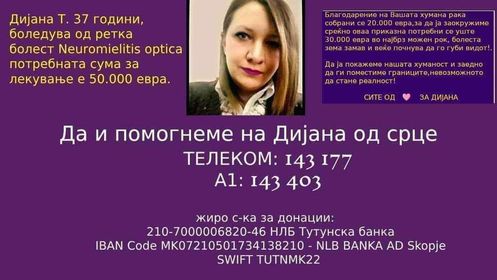 Дијана Трипуновска (37) боледува од ретка болест и е потребна нашата помош за лекување, кое чини 50 илјади евра.