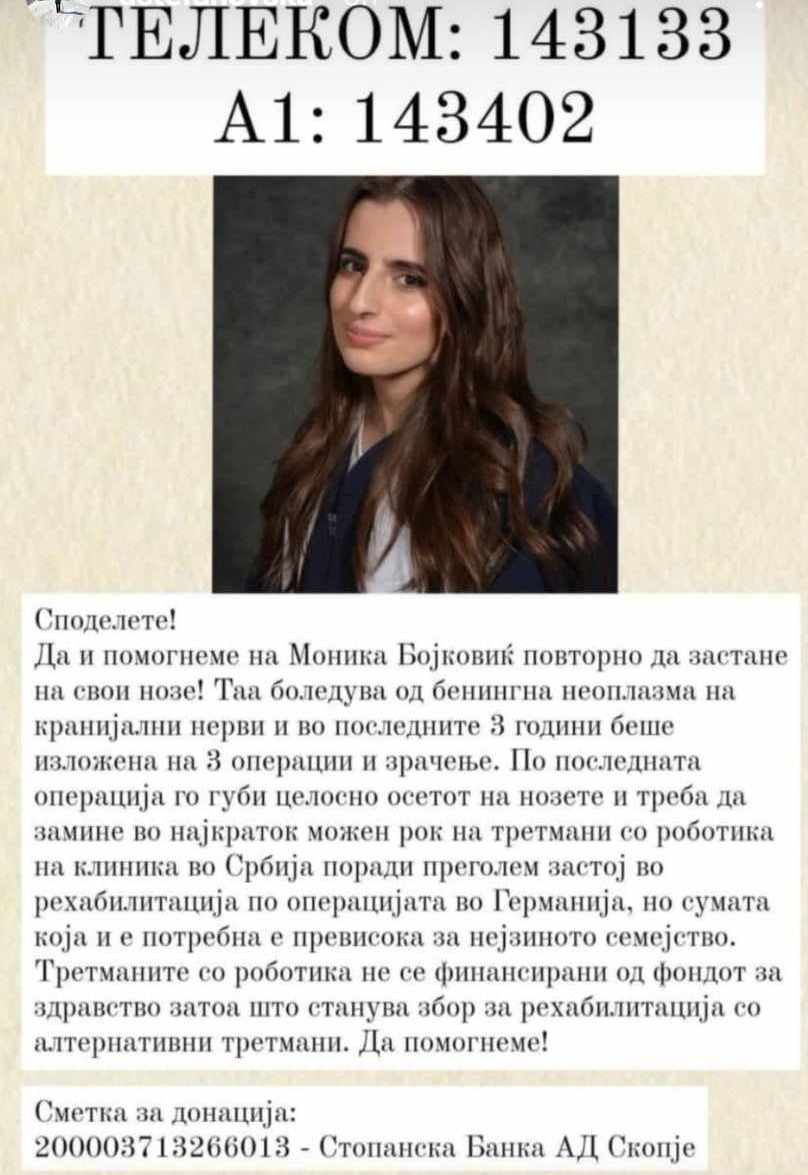 По последната операција таа целосно го изгубила осетот на нозете и за најкраток можен рок треба да замине на третмани со роботика на клиника во Србија, поради преголем застој во рехабилитација по операцијата во Германија. Сумата која ѝ е потребна, е превисока за нејзиното семејство.