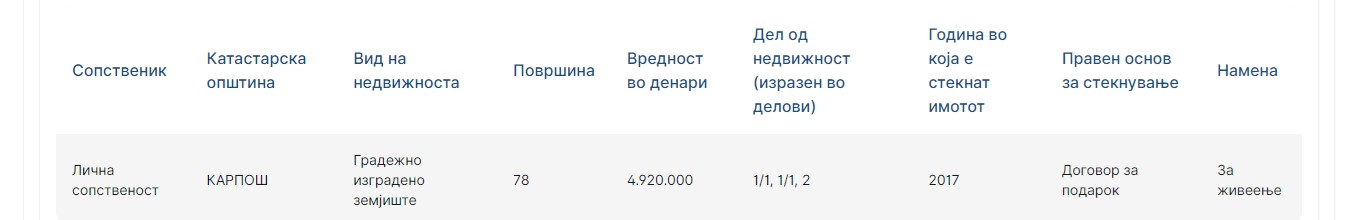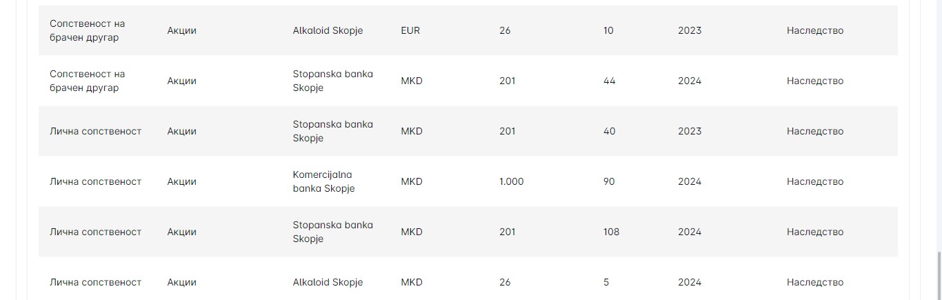 Од наследсство пријавил и акции во Алкалоид АД Скопје, Комерцијална банка АД Скопје и Стопанска банка АД Скопје.