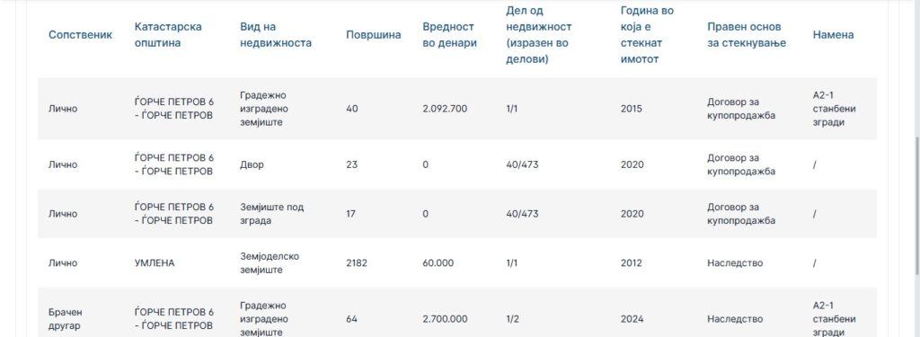 На свое име пријавила стан во скопско Ѓорче Петров и земјоделско земјиште од наследство во Умлена.