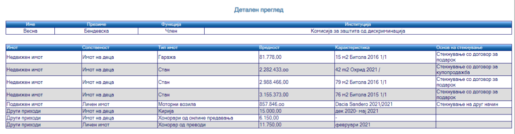 еМагазин го разгледа нејзиниот анкетен лист кој го доставила до Антикорупциската комисија кога стана член на Комисијата за заштита од дискриминација, каде беше и претседателка.