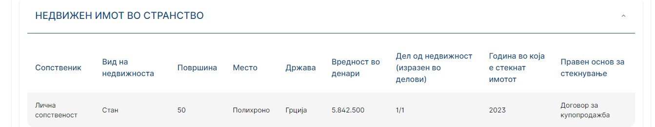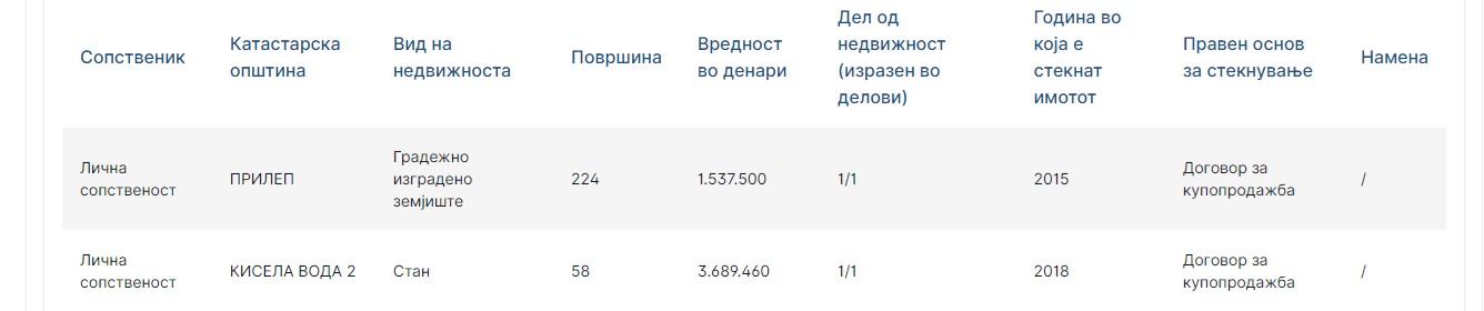 На свое име има стан во скопска Кисела вода и градежно изградено земјиште во Прилеп.
