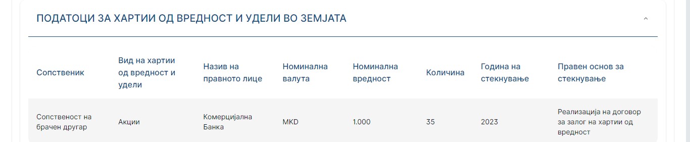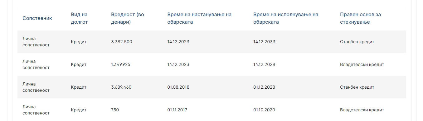На име на децата има орочени депозити, има заем од 3,2 милиони денари, кој треба да го врати до 2031 година и неколку кредити.