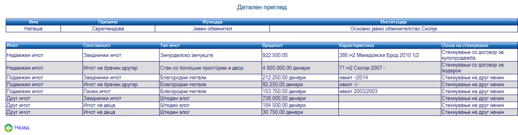 На свое име, на име на сопругот и како заеднички имот пријавила и благородни метали – накит, а на име на децата штедни влогови.