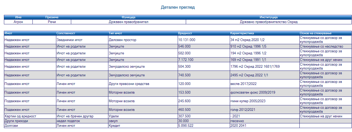 Приходи има и од закуп, на име на сопругата пријавил и удели, но не навел каде, а на свое име има кредит од 5,8 милиони денари, кој треба да го врати до 2041 година.