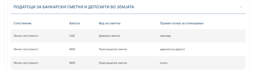 Единствено податок кој стои во неговиот анкетен лист е тој за банкарски сметки и депозити.