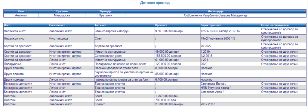 Каков имот пријавил Антонио Милошоски, кој е избран за потпретседател на Собранието