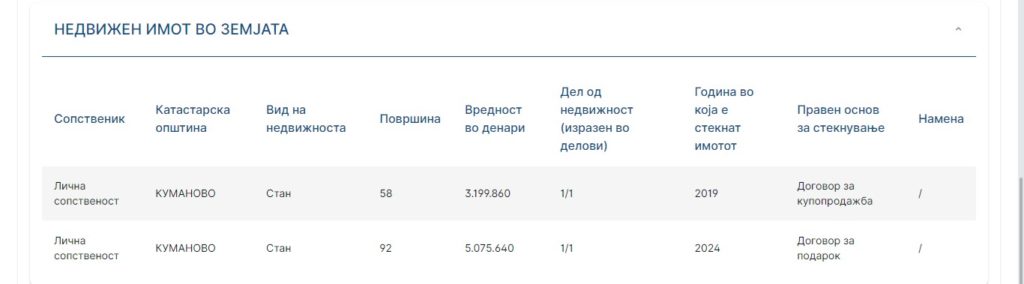 На свое име има два стана во Куманово, од кои едниот е подарок.