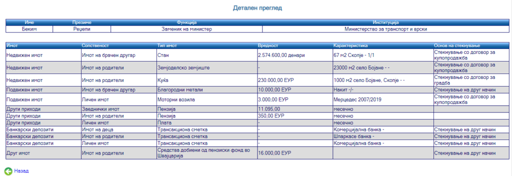 На име на сопругата пријавил стан во Скопје, а на име на родителите куќа и земјоделско земјиште во скопското село Бојане.