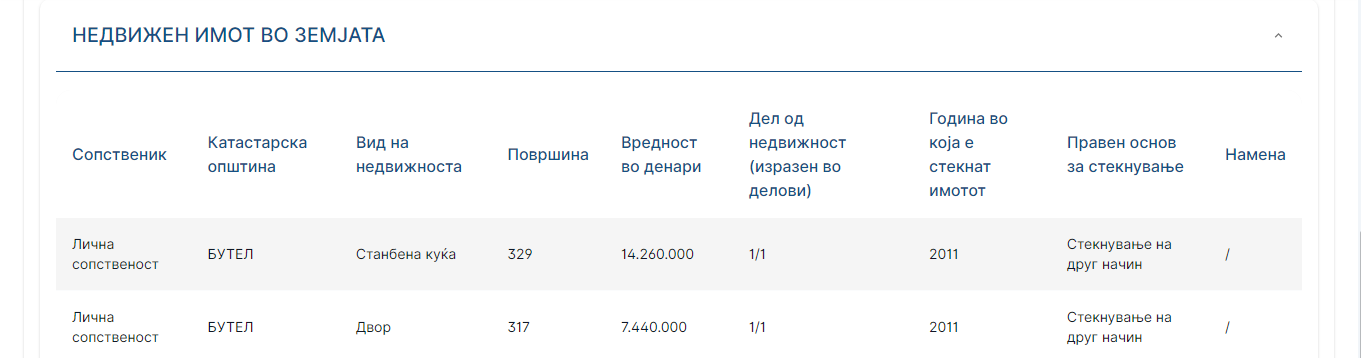 На име на сопругата од наследство пријавил 900 илјади денари.