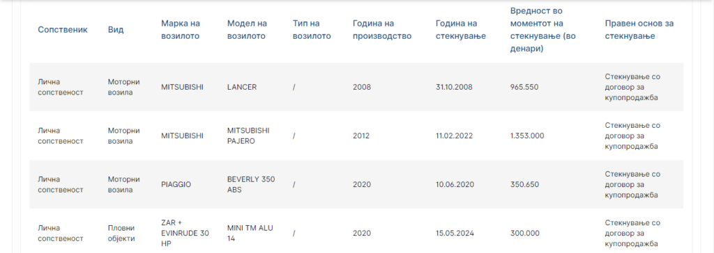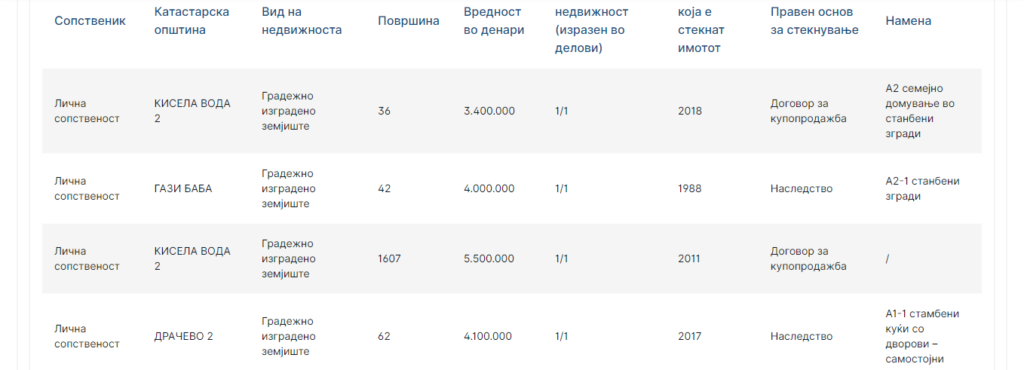 На свое име пријавил стан во скопска Кисела Вода, стан во скопска Гази Баба од наследство, куќа во скопско Драчево од наследство, како и градежно изградено земјиште во Кисела Вода.