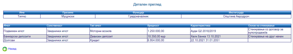 Како заеднички имот пријавил Ауди, девизен депозит и кредит од 6,9 милиони денари кој треба да биде вратен до 2051 година.