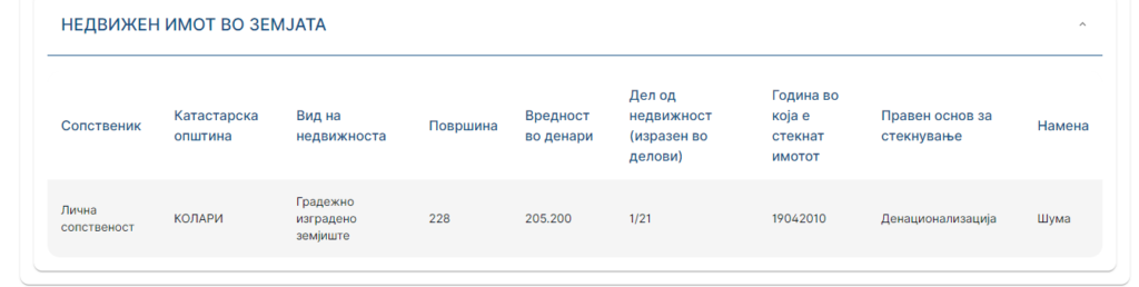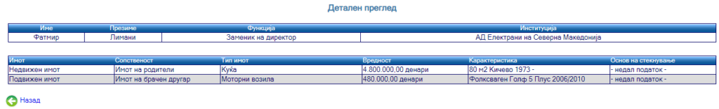 Во анкетниот лист кој го доставил до Антикорупциската комисија кога бил заменик-директор на Електрани на Северна Македонија (ЕСМ) на име на родителите пријавил куќа во Кичево, а на име на сопругата возило Фолксфаген Голф.