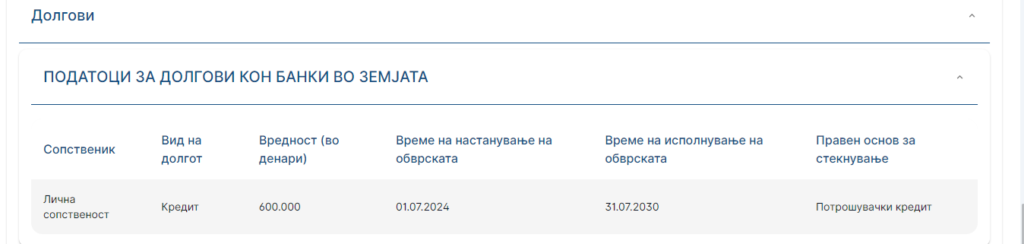 Има кредит од 600 илјади денари, кој треба да го врати до 2030 година.