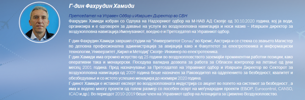 Фахрудин Хамиди е претседател на Управниот одбор и извршен директор за воздухопловна навигација. Тој како што стои на официјалната страна на М-НАВ е избран на оваа функција од 30. октомври 2020 година.