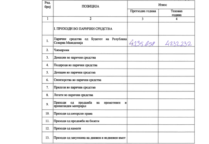 Од Буџетот или од граѓаните добила 17 милиони денари, од членарина 2 милиони денари, а од донации 1,5 милион денари, а оваа се донаторите: