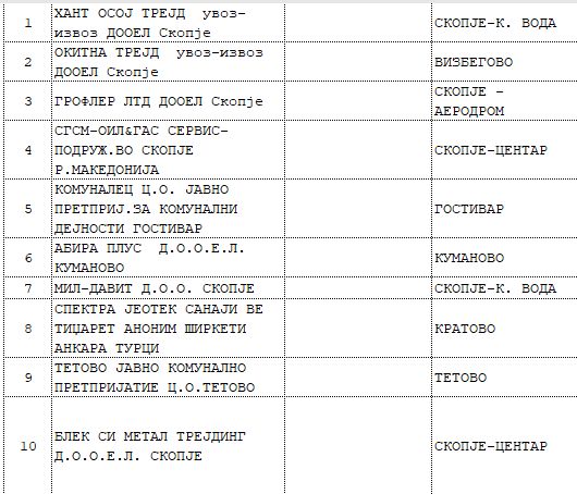 Управата за јавни приходи (УЈП) ја објави Листа на должници за долгови доспеани до 29.02.2024 и неплатени до 31.05.2024 година по основ на ДДВ, данок на добивка, персонален данок на доход, придонеси од задолжително социјално осигурување, акцизи и царини, за кои вкупниот износ на долгот е повисок од 120.000 денари за физичките лица и самостојни вршители на дејност и повисок од 300.000 денари за правните лица.