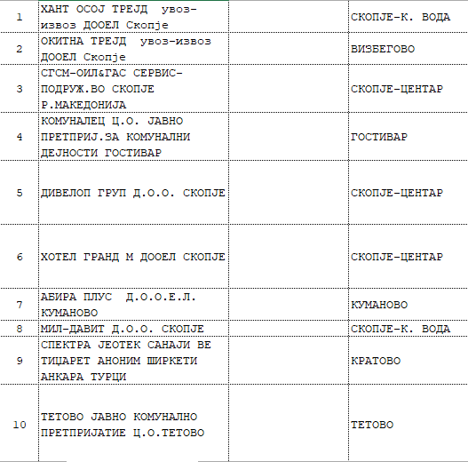 Најголем должник е Хант осој трејд од Скопје, а во првите десет должници веќе неколку месеци се и фирмите „Дивелоп груп“ и хотел „Гранд М“, кои се поврзуваат со поранешниот директор на Управата за безбедност и контраразузнавање (УБК), Сашо Мијалков.