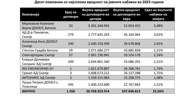 -Вредноста на договорите на „Д-р Пановски“ во 2023 година се за 241 % поголеми од 2022 година, кога изнесувале 13 милиони евра, стот во извештајот.
