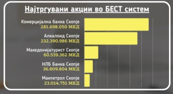 Со акциите на Комерцијална банка е остварен промет од 281,6 милиони денари, со акциите на Алкалоид, 232,3 милиони денари, а со акциите на Македонијатурист, 60,5 милиони денари.