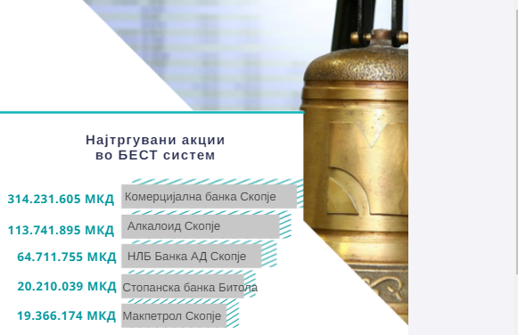 Акциите на Комерцијална банка АД Скопје, Алкалоид АД Скопје и НЛБ Банка АД Скопје, се најтргуваните изминатиов месец, покажува месечниот билтен на Македонската берза.