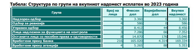 -Во вкупните надоместоци што им се исплаќаат на вработените и на членовите на органите на Банката влегуваат: фиксен дел од вкупниот надоместок, кој зависи од описот на работното место, односно од надлежностите на органот на Банката, а не зависи од успешноста во работењето (надоместок во форма на плата) и варијабилен дел од надоместокот, кој зависи од долгорочната успешност во извршувањето на работните задачи, имајќи го предвид преземеното ниво на ризик (бонуси и останати непарични примања).