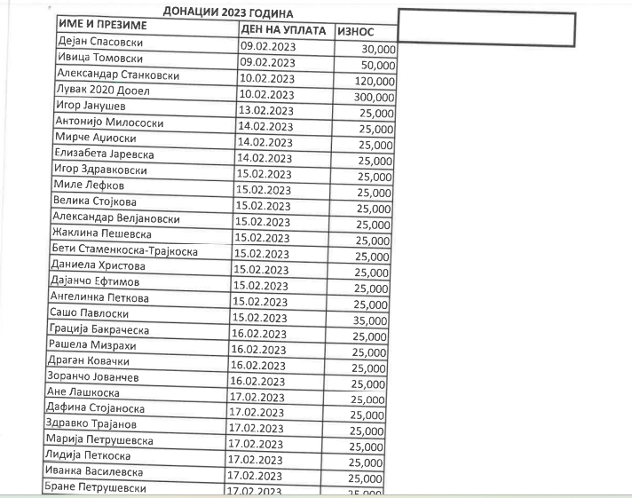 Меѓу донаторите се и функционери на партијата како Антонио Милошески, Миле Лефков, Игор Јанушев, Ане Лешкоска…
