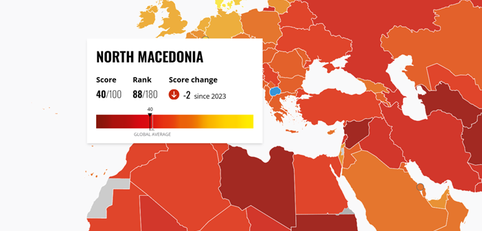 Македонија на Индексот за корупција на „Транспаренси интеренешенал“ за 2024 година, објавен денеска, бележи пад од дури 12 места, споредено со 2023 година, и се наоѓа на 88. место.