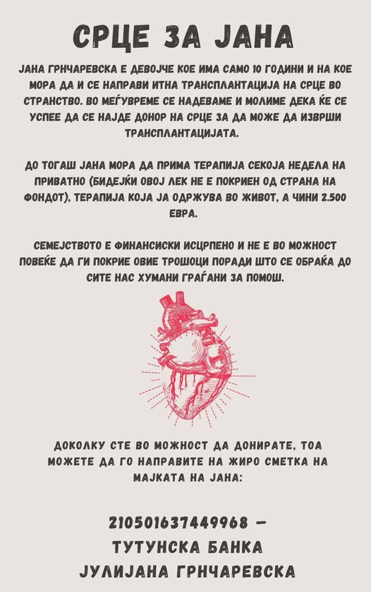 Хоспитализирана е во неколку наврати и лекувана со соодветната терапија за дијагнозата, но за жл за да се спси нејзиниот живот покрај терапијата мора да се направи срцева трансплантација во педијатриски кардиохируршки центар во странство,“ се вели во апелот за помош.
