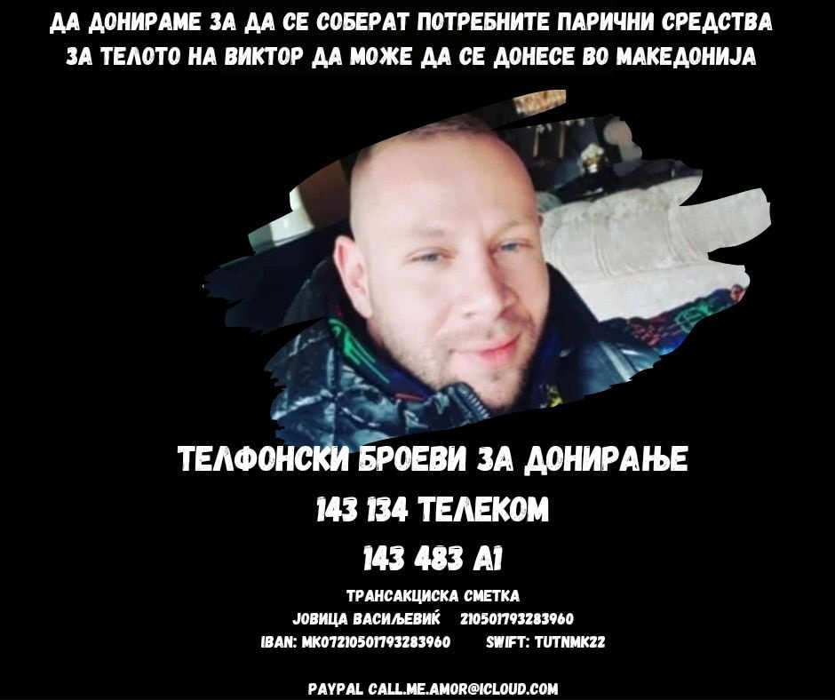 Недостасуваат уште 1.000 евра од потребната сума за да телото на Виктор Васиљевиќ биде транспортирани во Македонија од Шпанија и да почива во мир, стои во апелот на социјалните мрежи.