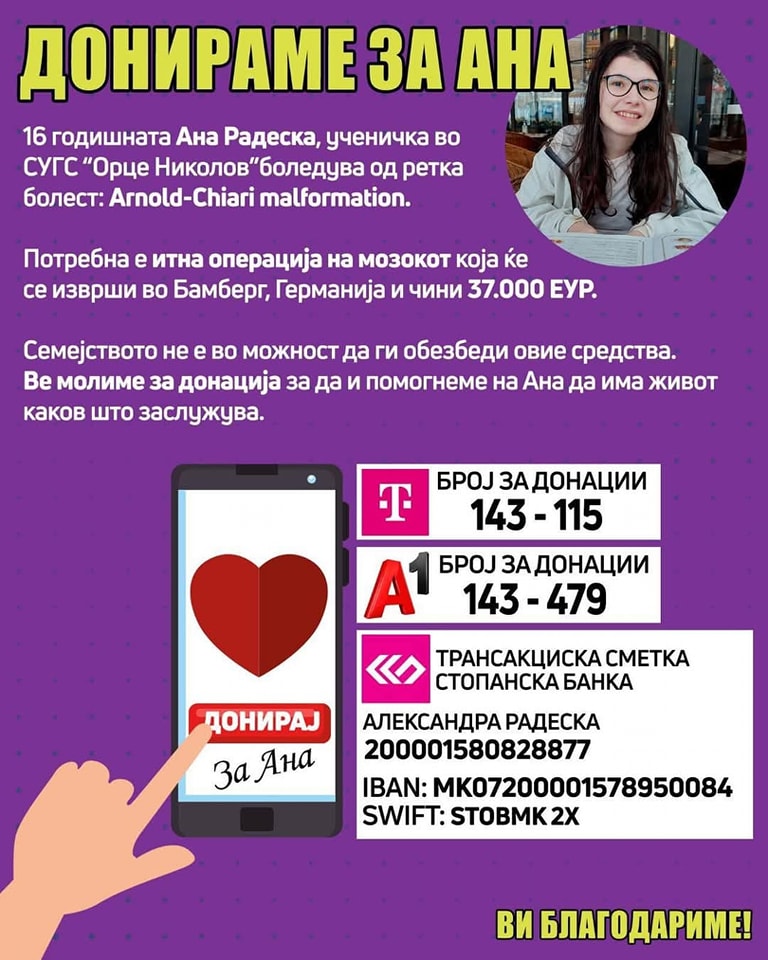 Отворени се и телефонски броеви за помош на 16-годишната Ана Радевска на која и е потребна нашата помош за лекување во Германија, кое чини 37 илјади евра.