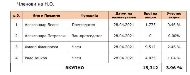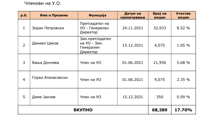 Во Годишниот извештај за минатата година, објавен преку Македонската берза, Адинг АД Скопје, објави и по колку акции поседуваат членовите на Управниот и Надзорниот одбор: