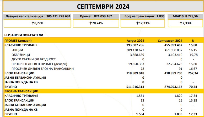 Македонската берза го објави билтенот за септември кој покажува раст на прометот за 70,7’% и раст на бројот на трансакциите за 17,33%.