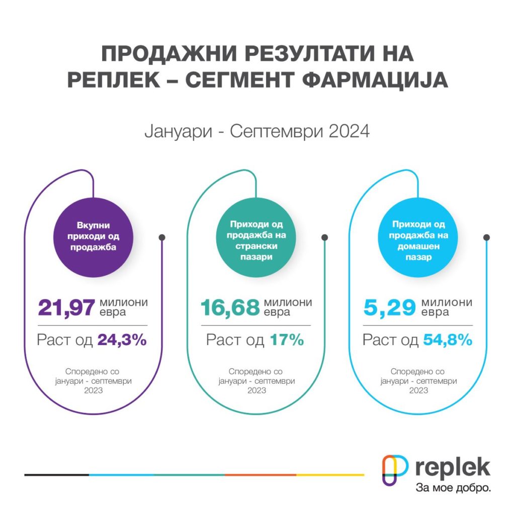 Кумулативно, за изминатите девет месеци од оваа година, „Реплек АД“ оствари продажба на домашниот пазар во вредност од близу 5,3 милиони евра, што е за 54,8% повеќе од лани, како и продажба на странските пазари во вредност од над 16 милиони евра, што е за 17% повисоко од остварувањето во истиот период минатата година.
