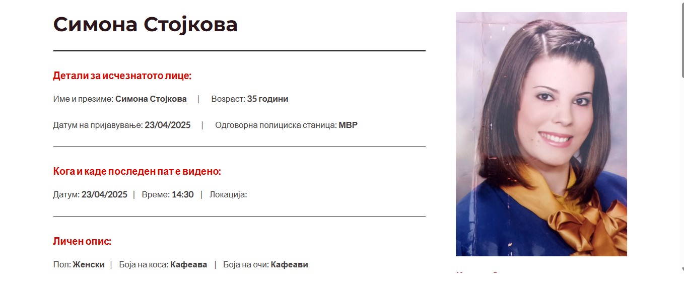 Симона Стојкова (35) од Скопје за која од платформата najdime.org.mk вчера информираа дека е исчезната, доцна синоќа се огласи на нејзиниот Фејсбук профил, на кој напиша дека не е исчезната и дека се работело за лажна тревога.