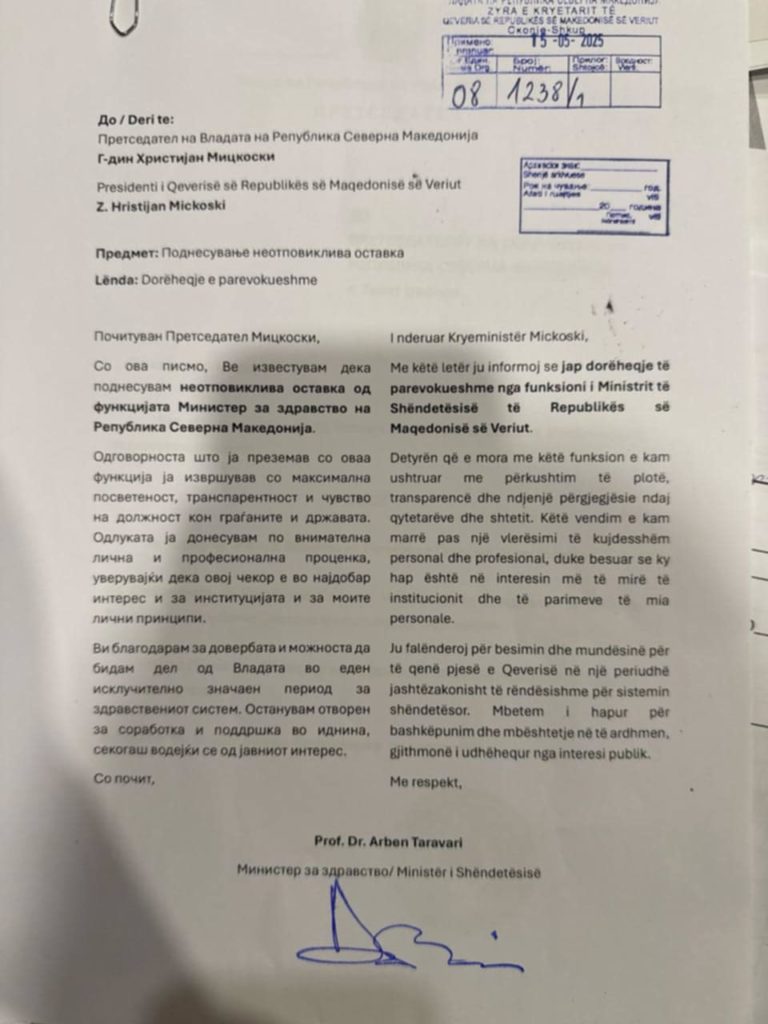 Како и што најави вчера, министерот за здравство, Арбен Таравари денеска поднесе оставка и истата е веќе доставена до премиерот Христијан Мицкоски.