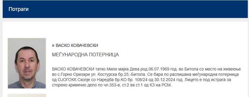 (Фото) МВР распиша меѓународна потерница за Васко Ковачевски