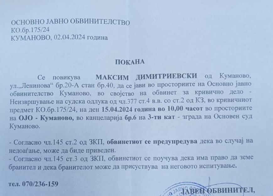 Тој од Основното јавно обвинителство Куманово добил покана да се јави во Обвинителството, бидејќи е обвинет за кривичното дело „Неизвршување на судска одлука“.