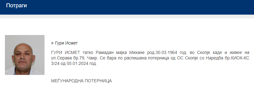 Министерството за внатрешни работи објави меѓународна потерница од избеганиот од домашен притвор, Исмет Гури, поранешен функционер на владејачката ДУИ.