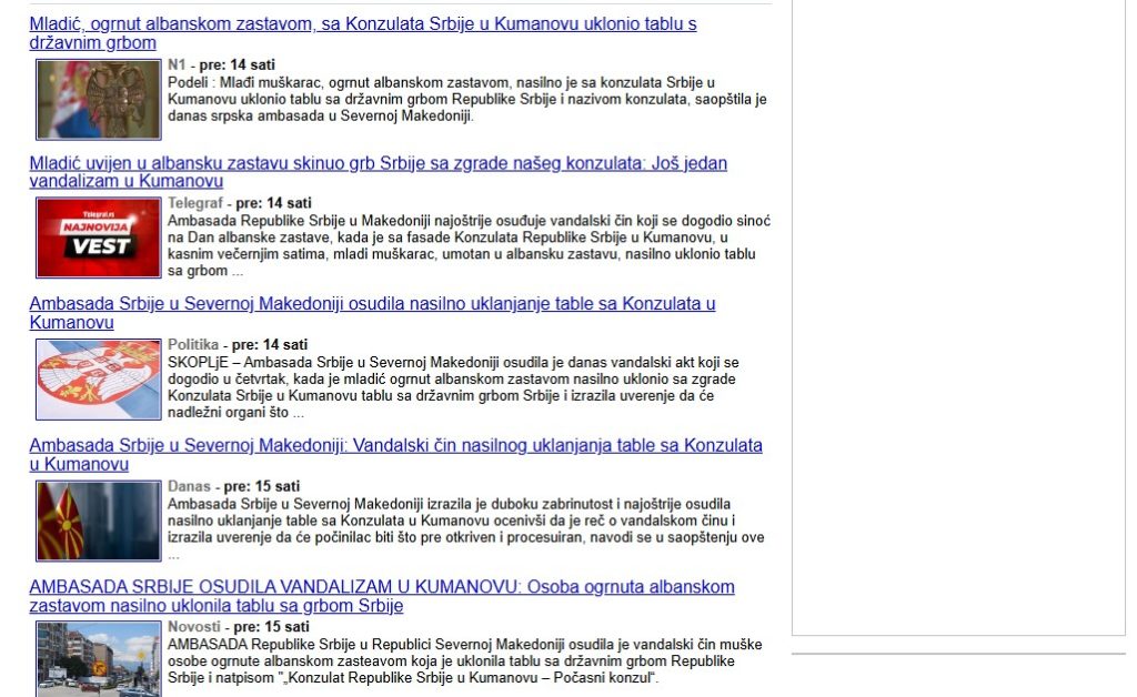 Очекувано, инцидентот со откорнување на таблата на Конзулатот на Србија во Куманово, од страна на момче на денот на албанското знаме е една од топ темите во српските медиуми.