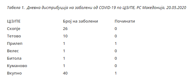 Во Македонија вчера беа регистрирани 40 нови случаи на заразени со коронавирусот.