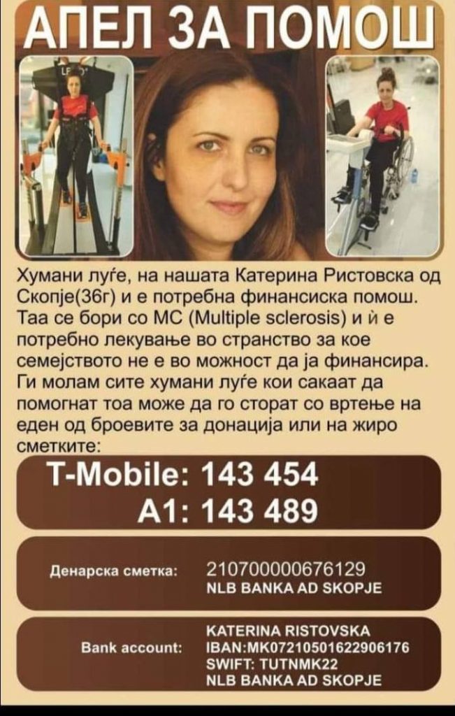 Катерина Ристовска (36) боледува од мултиплекс склероза и потребно е да се лекува во странство.