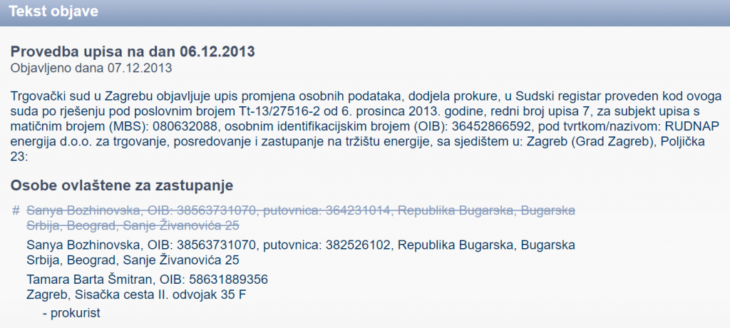 -На ден 6.12.2013 година, кога се правени измени во структурата на компанијата, освен што ѝ е споменато името Sanya Bozhinovska, пишува и дека лицето има матичен број (личен идентификациски број): 38563731070 и број на пасош 382526102, но не на Република Македонија, туку на Република Бугарија. И дека живее на адреса во Белград.