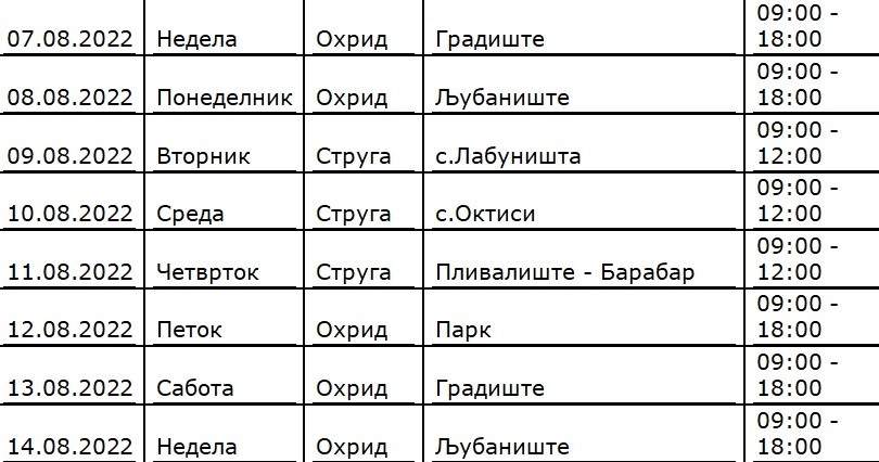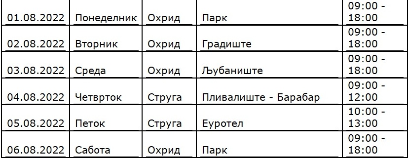 Во продолжение листата на локации предвидена за периодот од 1.08.2022 до 14.08.2022 година: